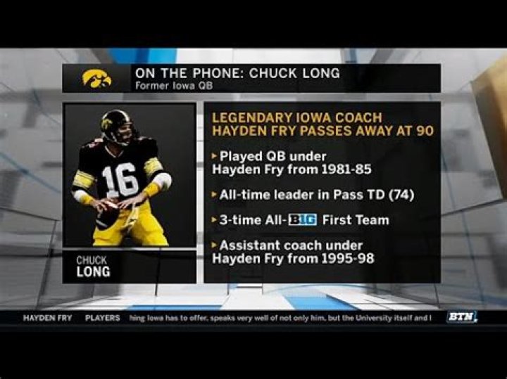 Charles Franklin "Chuck" Long, Jr. (born February 18, 1963) is an American football coach. He played quarterback in college at Iowa for Hayden Fry and professionally with the Detroit Lions and the Los Angeles Rams. He is an inductee of the College Football Hall of Fame. In the January 2008 issue of San Diego Magazine he was chosen as one of the "50 People to Watch in 2008". He was fired by San Diego State University as its head football coach on November 23, 2008. Long was the offensive coordinator for the Kansas Jayhawks under head coach Turner Gill. before Gill was fired in 2011. As of summer 2013, he is an analyst for the Big Ten Network | Net Worth | $14 Million |